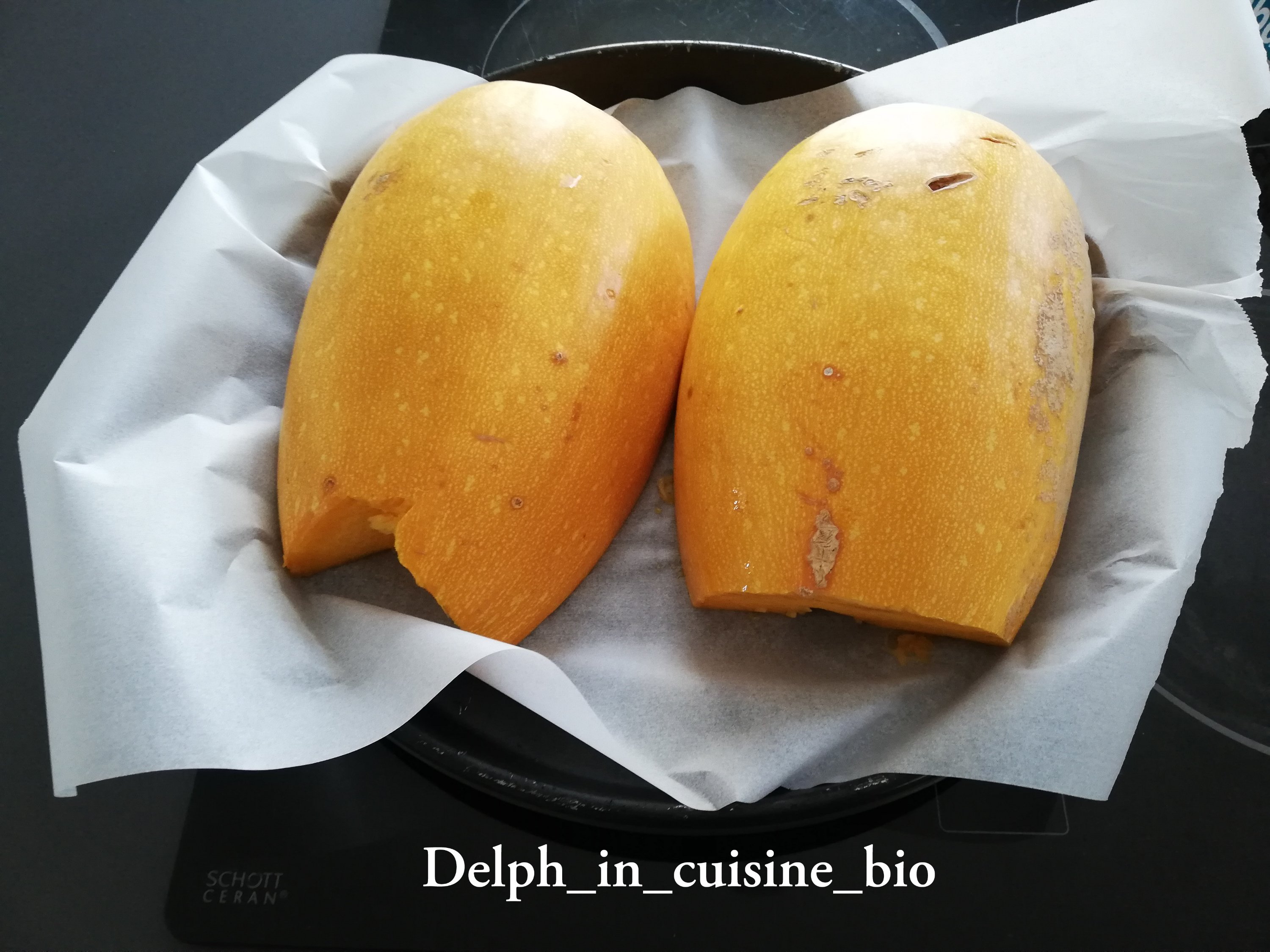 - Placer la sur une plaque garni de papier cuisson, face contre le papier. Enfourner 30 minutes puis retourner la courge en couvrant de papier alu. Poursuivre la cuisson 15 minutes.