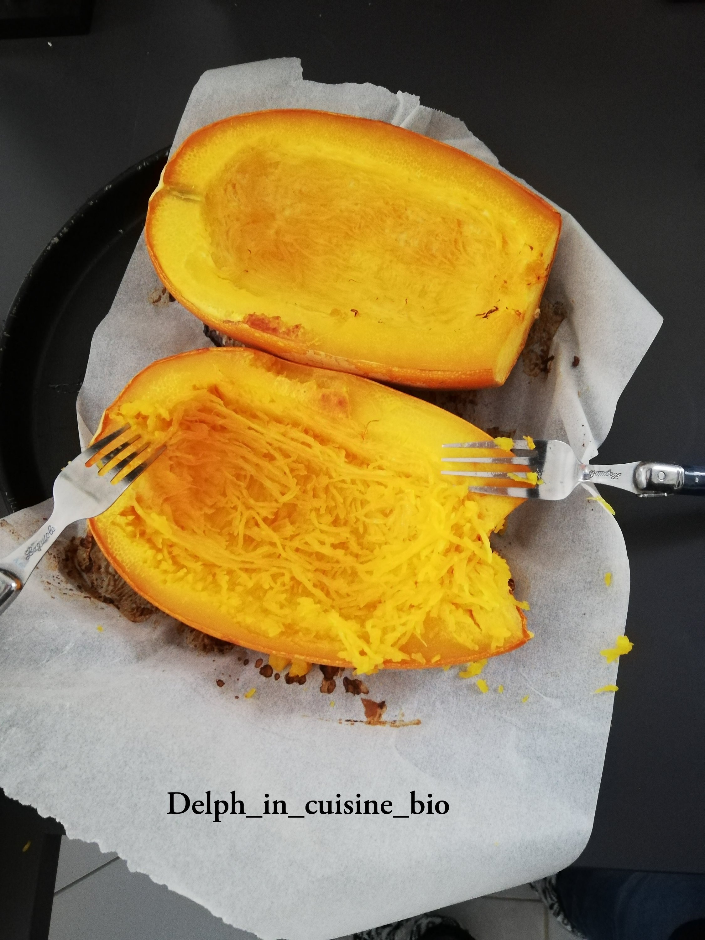 - Une fois la courge cuite, la laisser refroidir un peu et gratter la chaire à l’aide d’une fourchette pour former des spaghetti.