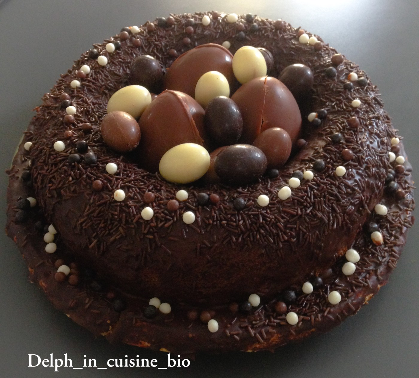 Il s’agit d’un gâteau de Savoie, gâteau hyper léger en bouche, recouvert d’une ganache au chocolat noir🍫, et décoré de vermicelles et billes en chocolat, et bien évidemment garni d’œufs🥚! Ici, j’ai choisi d’y mettre des petits œufs pralinés au chocolat noir, chocolat au lait et chocolat blanc et des gros œufs que j’ai fait moi même!