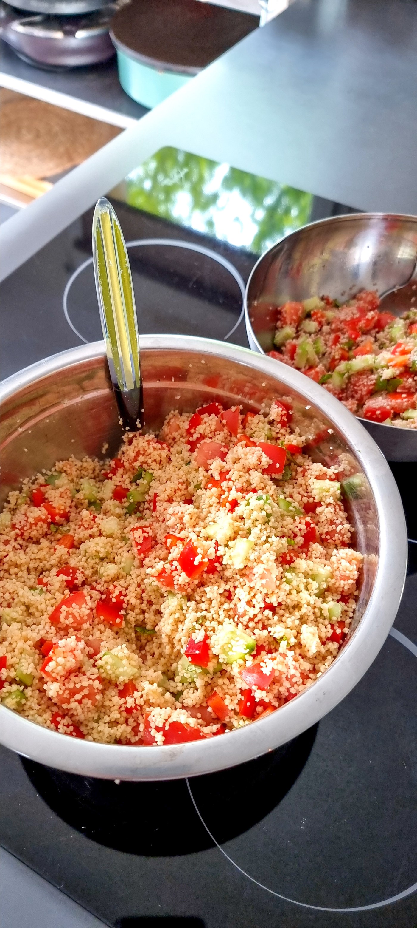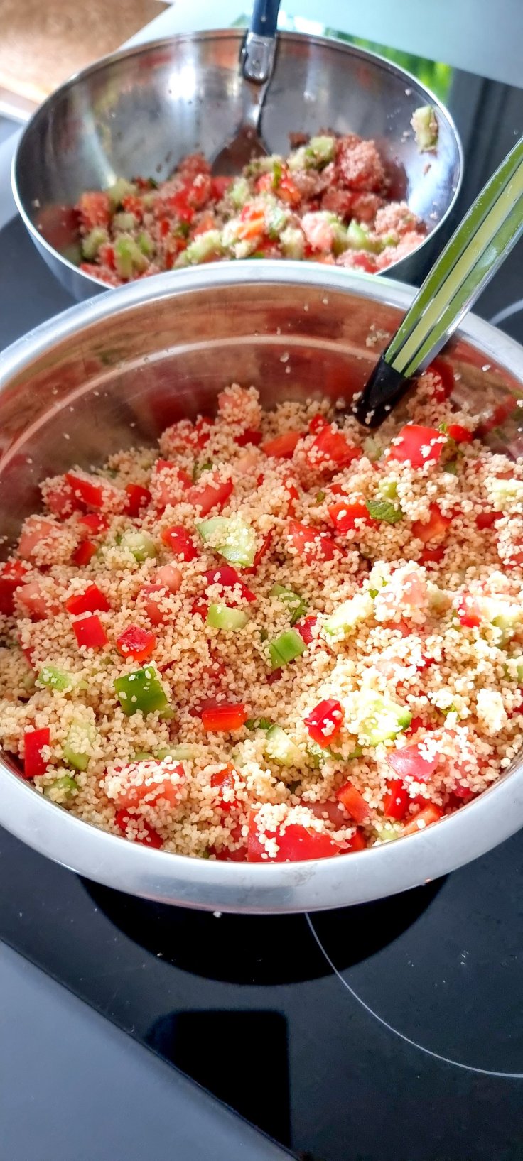 Voici une délicieuse recette de taboulé maison, facile et rapide à préparer, aromatisé au citron et à la menthe. A base de semoule, tomate, concombre, poivron, oignon et herbes aromatiques.