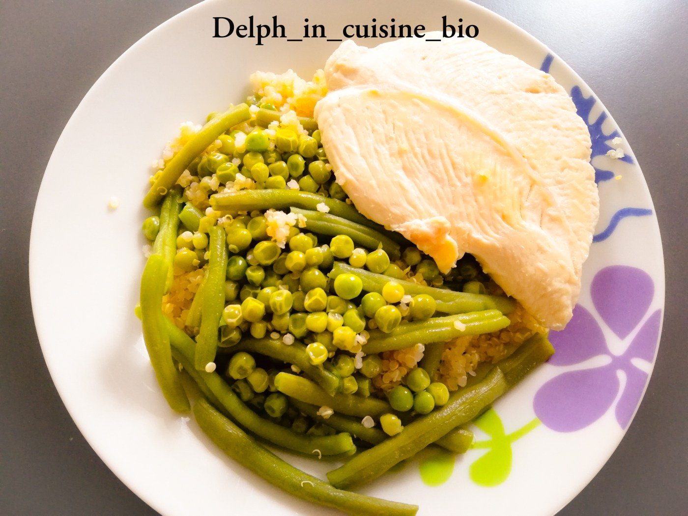 Tout est dit dans le titre ! Si vous disposez d’un Thermomix, tout est cuit en même temps ! Sinon vous pouvez cuire la quinoa, les légumes et la dinde séparément ! C’est excellent ! Une idée de repas familial, complet et sain !