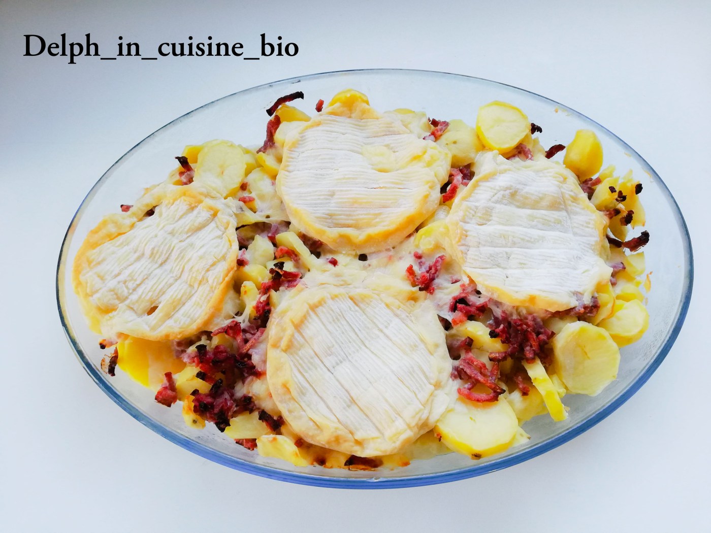 - Couper un reblochon en deux dans l’épaisseur et le poser sur le dessus du plat, croûte à l’extérieur.