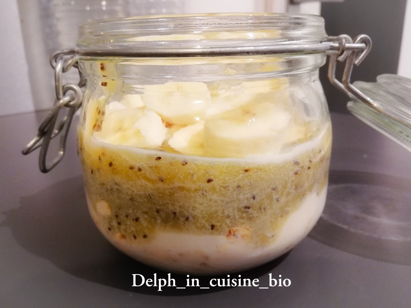 - Le matin, sortir le bocal et y ajouter la banane et le kiwi, découpé en morceaux.