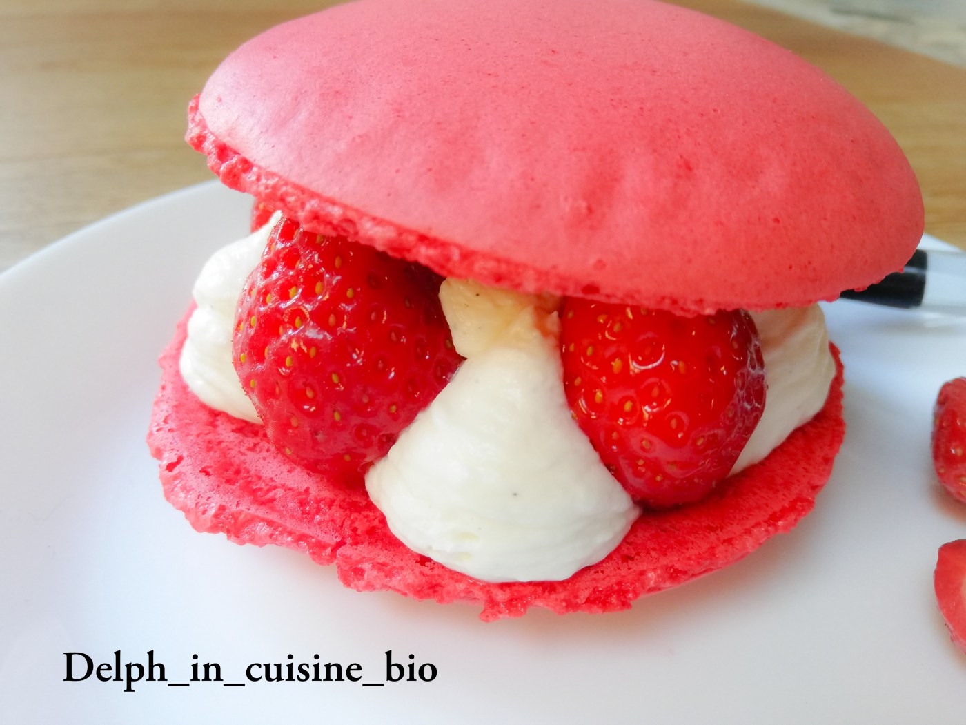 - Pour le montage, prenez une coque de macaron, y disposer les fraises et la crème chantilly à l’aide d’une douille. Refermer d’une coque de macaron. Monter toute les macarons géant.