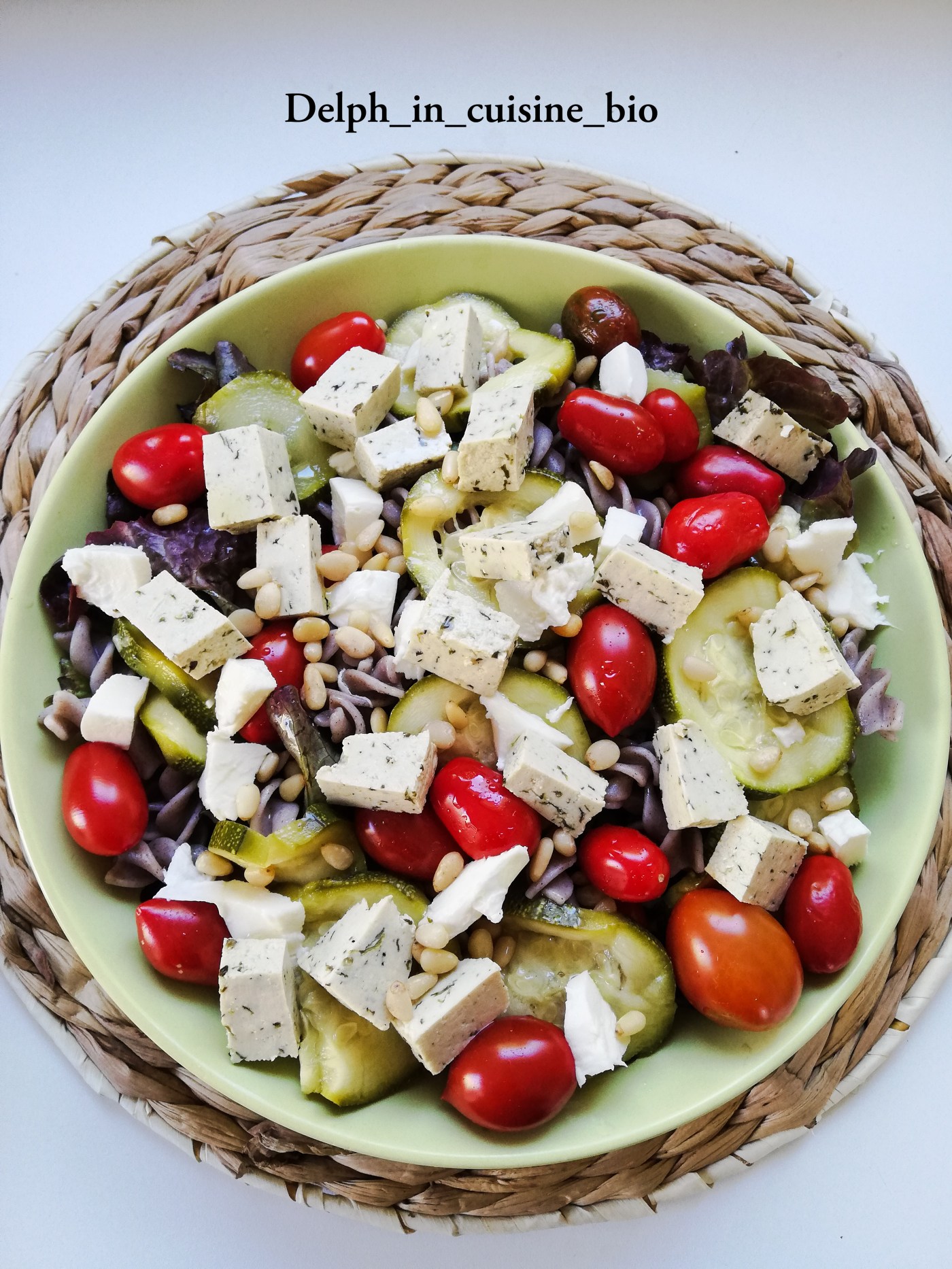 - Ajouter la courgette, les tomates cerise, la feta, les pignons de pin, les dés de tofu.