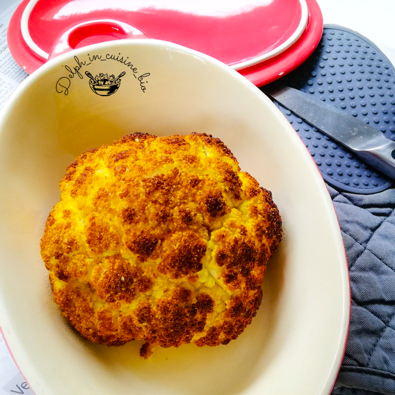 - Mettez au four à 180°C pendant 1h30 à 2 heures, selon la taille de votre chou fleur, pour qu’il soit bien fondant 🙂