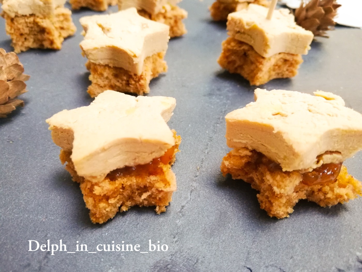 - Monter vos canapés : 1 étoile de pain d’épices, un peu de confit de figues et une étoile de fois gras.