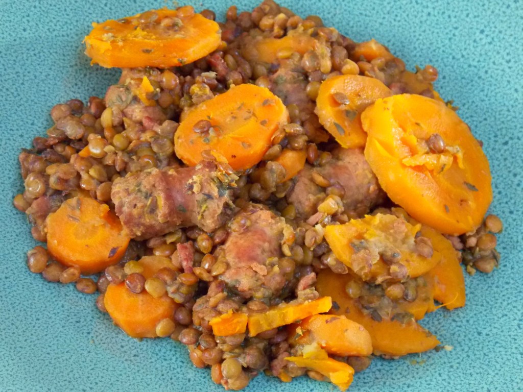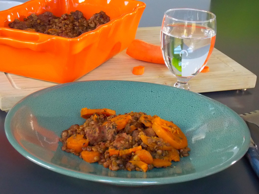 - Une fois que c’est cuit, ajouter 400g de carottes coupées en rondelles, 300g de lentilles vertes, un peu de coriandre et de thym. Bien mélanger.