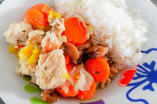 La blanquette est un plat mijoté, composé de carottes, de champignons de Paris et de poireaux! Avec un portion de riz, cela fait un repas complet, sain et de saison!