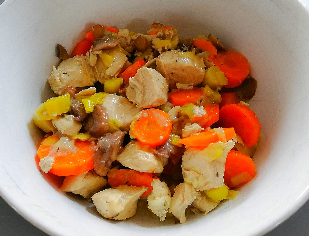 - Mettre le thym, le laurier, le persil, 200g de poireaux coupés en rondelles, 300g de carottes, 10g d’huile d’olive, le sel, 900g d’eau et 600g d’escalopes de poulet coupés en morceaux le bol. Mijoter 35 min/100°C/sens inverse/mijotage.