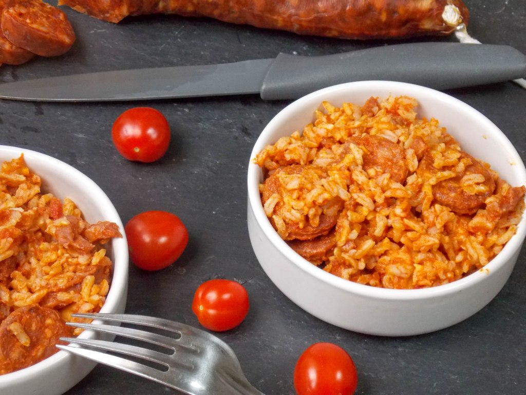 - Ensuite, ajouter 200g de riz, le bouillon de volaille dilué avec l’eau, 400g de tomates concassées, le chorizo en rondelles et le sel. Programmer 20 minutes en cuisson sous pression (8 minutes suffisent pour du riz basmati blanc).