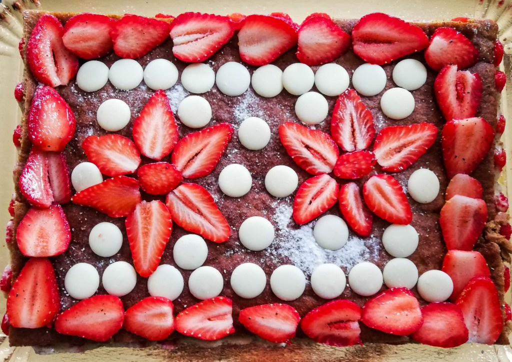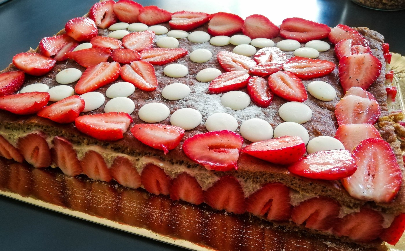 - Décorer selon votre goût : ici quelques fraises coupées en lamelles pour faire le tour du gâteau, 2 fraises coupées en lamelles placées en forme de fleur et quelques pastilles de chocolat blanc.