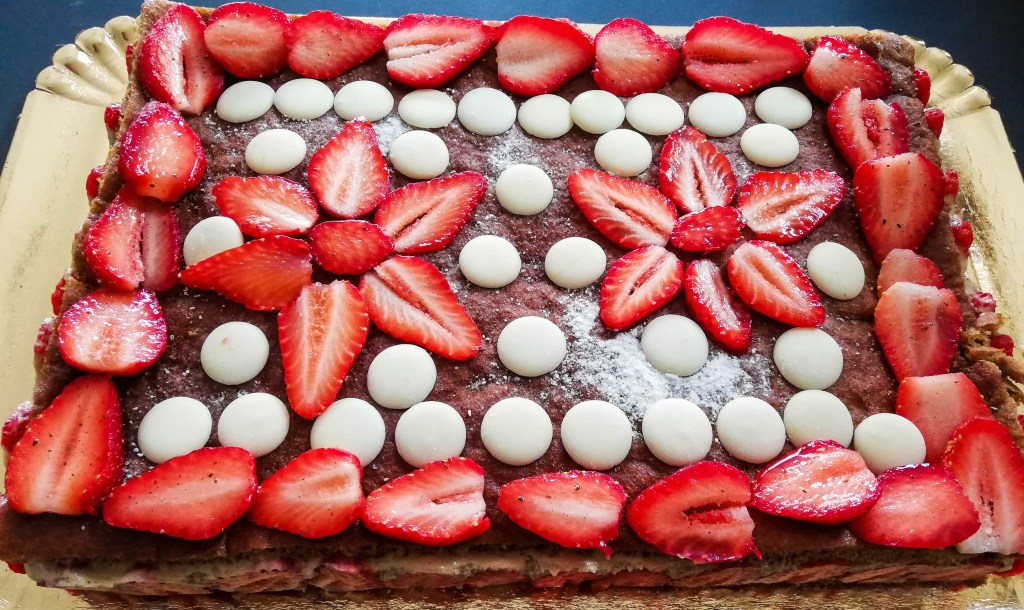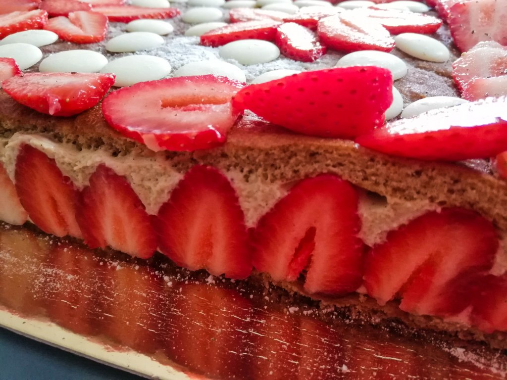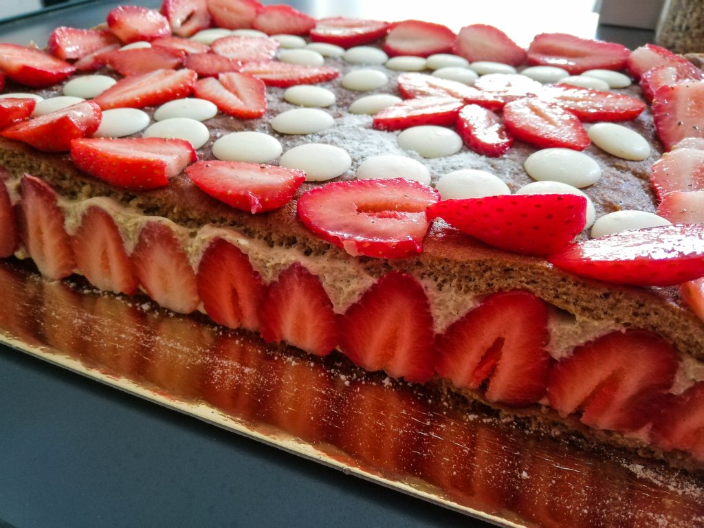 Dans cette recette, les spécialistes de la pâtisserie ont déjà remarqué que je fais le fraisier avec de la crème diplomate (crème pâtissière + crème fouettée + gélatine). Je la préfère à la crème mousseline (crème pâtissière + beurre) , traditionnellement utilisée dans le fraiser, car elle est plus légère. De plus, grâce à la farine d’amarante, la farine d’orge mondée et au sucre de coco, ce fraisier à un index glycémique bas.
