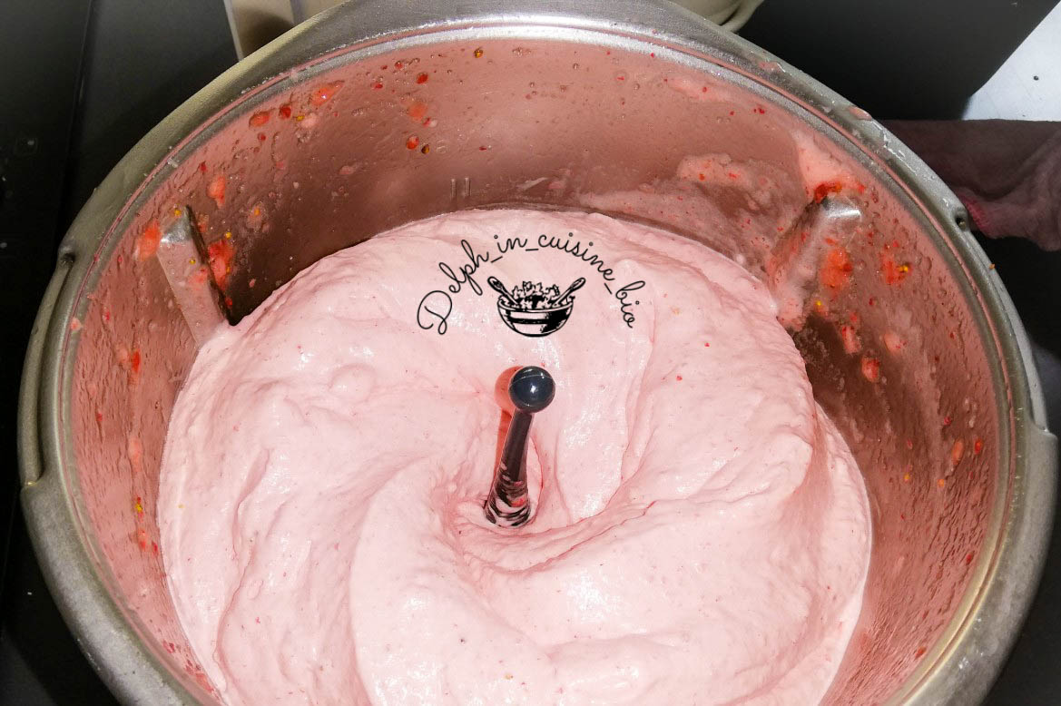 - Ajouter 500g de fraises congelés, 15g de jus de citron et le blanc d’œuf. Mixer 1 min 30 sec/vitesse 5 en vous aidant de la spatule.