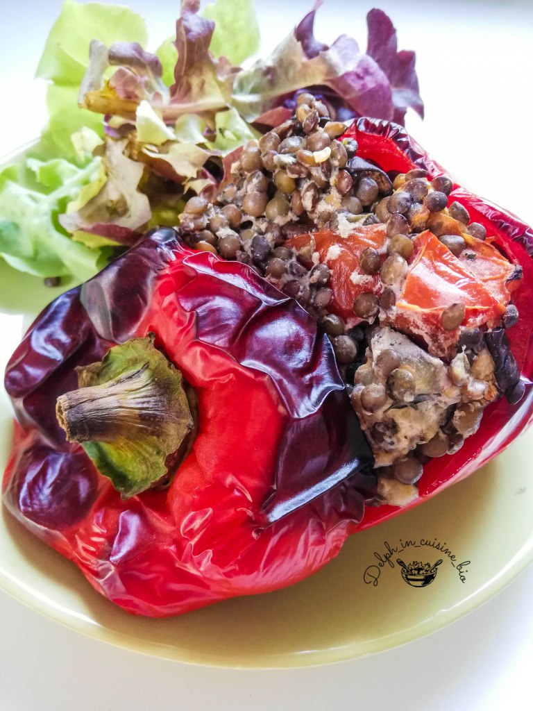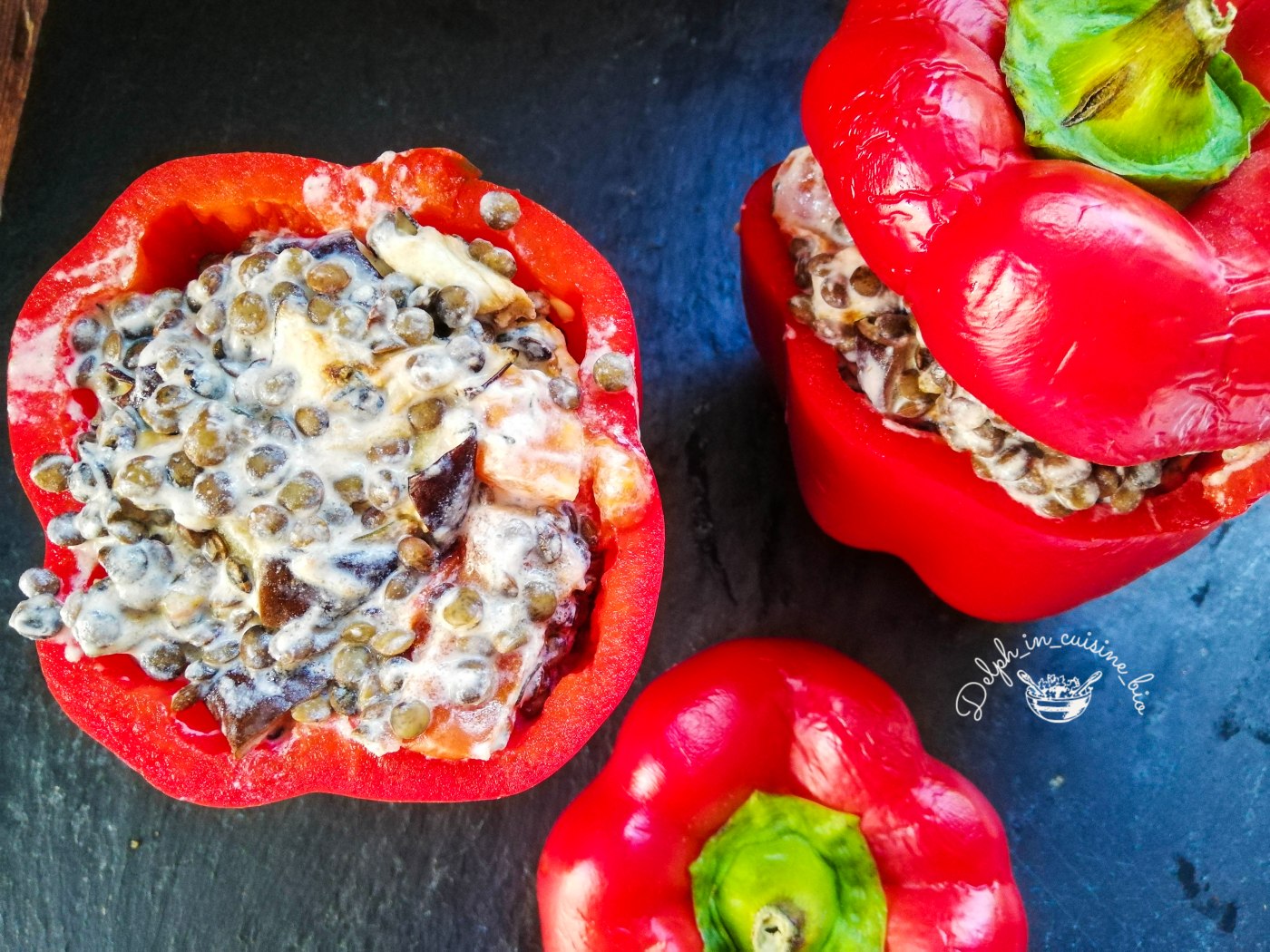 - Couper la tête des poivrons retirer les pépins. Les farcir du mélange lentilles/légumes.