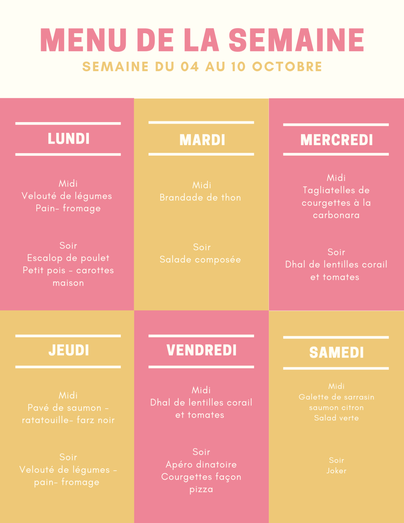Menu de la semaine du 04 au 10 octobre