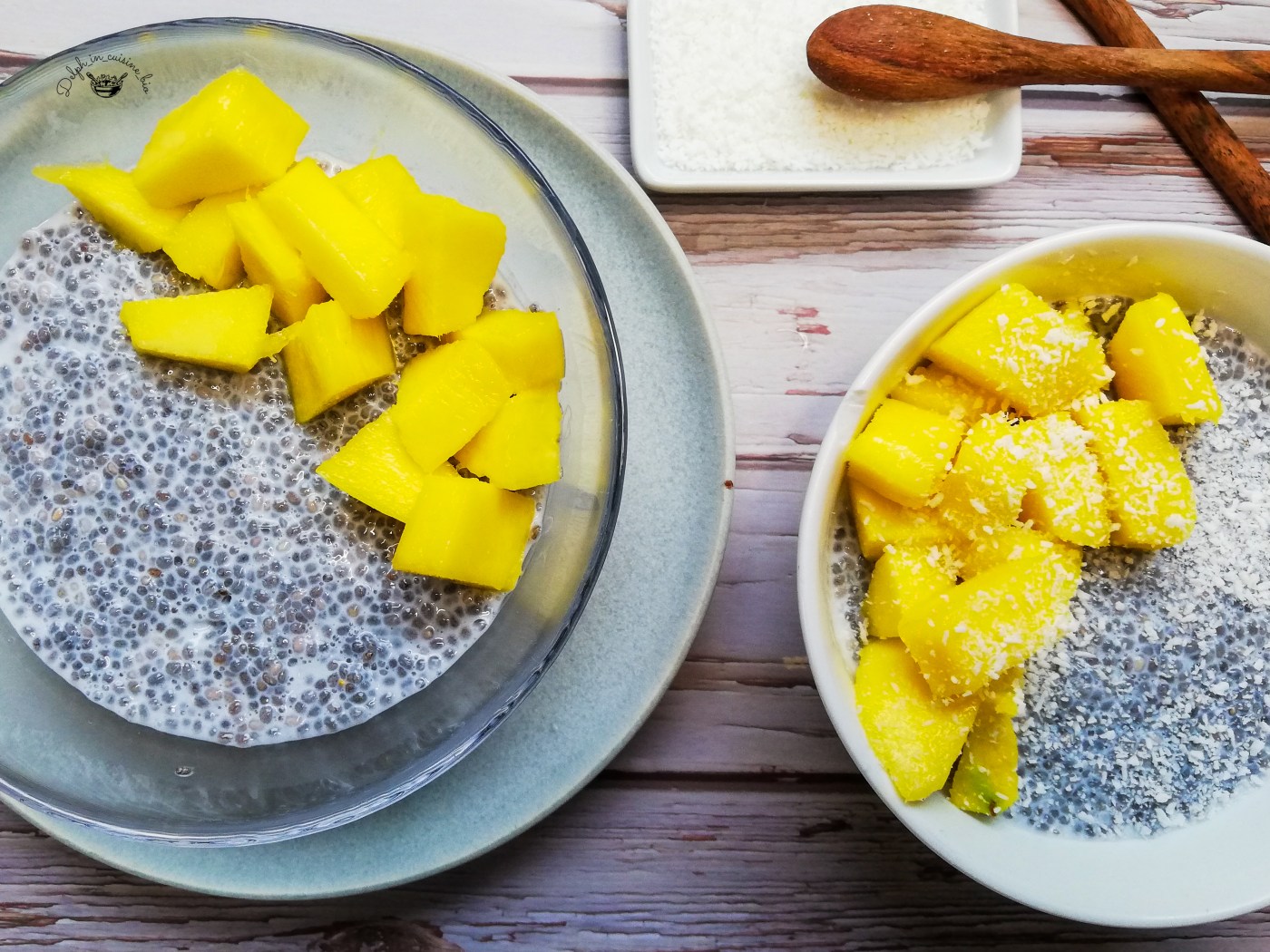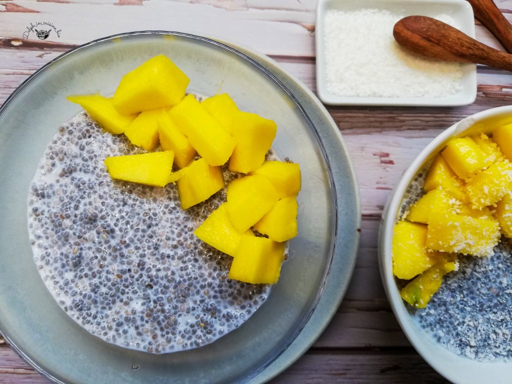 - Au moment de la dégustation, ajouter la 1/2 mangue coupée en morceaux et parsemer de noix de coco râpée.
