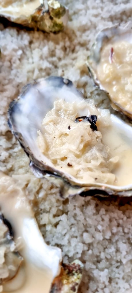 - Répartir cette crème sur les huîtres, puis enfourner pour 5 minutes sous le gril, jusqu’à ce que les huitres soient dorées.