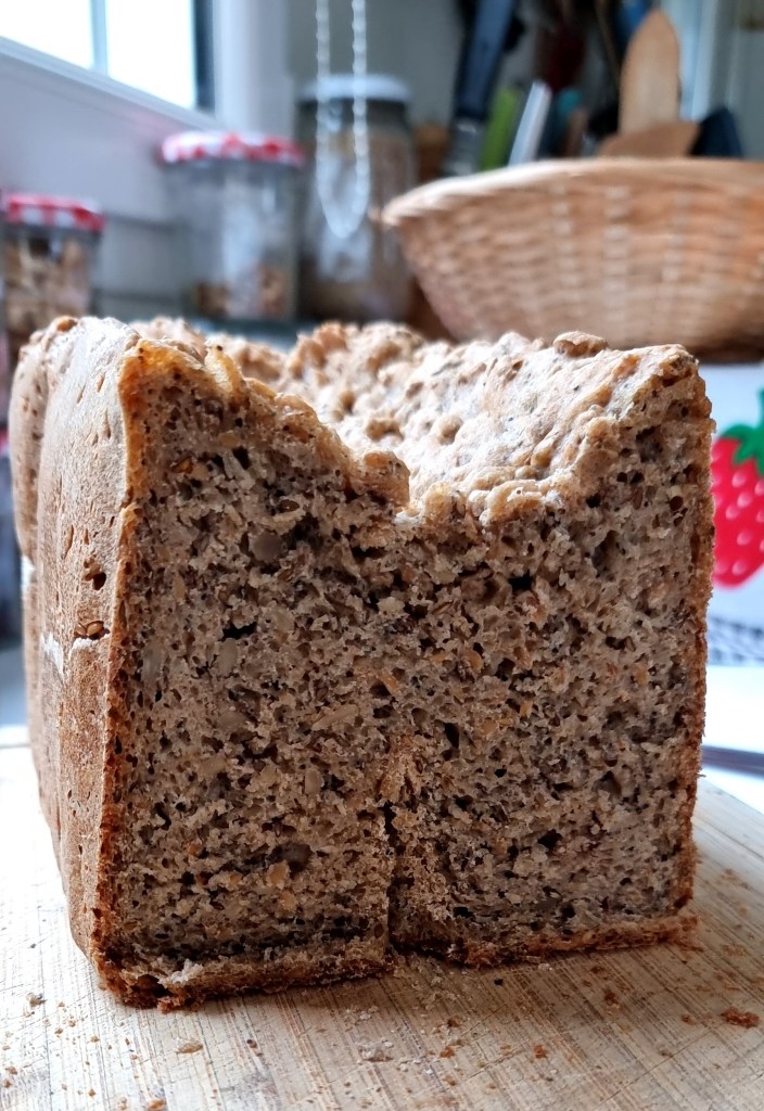 Dans le moule à pain, y mettre 480ml d’eau, 2 cuillères à soupe de colza, 200g de farine de blé, 230g de farine de seigle, 230g de farine de petit épeautre et 20g de levure boulangère. Mettre à pétrir selon votre machine à pain ou avec votre Thermomix. Ajouter les graines et remettre à pétrir quelques minutes.