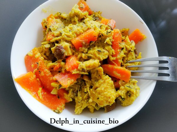 Accompagner de quinoa, vous apprécierez ce plat hyper facile, léger, digeste et super réconfortant = un mijoté de dinde aux épices, carottes et raisins secs. Ingrédients pour 6 parts, 1SP/part : 3 oignons 10g d'huile d'olive 6 carottes 500g d'escalopes de dinde 1 cuillère à café de cumin 1 cuillère à café de curcuma 1... Lire la Suite →